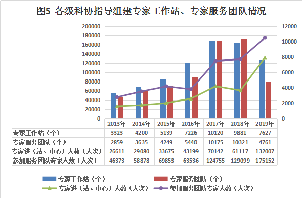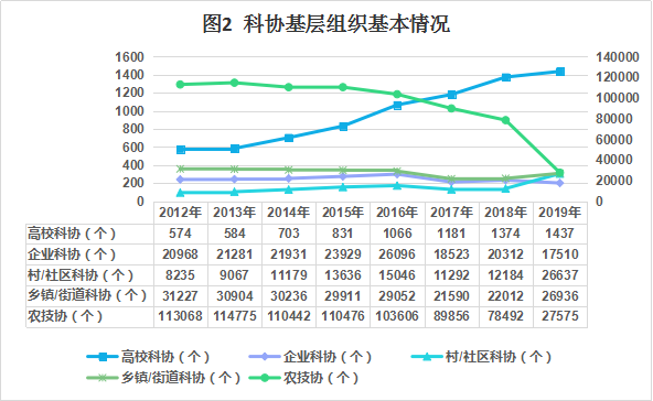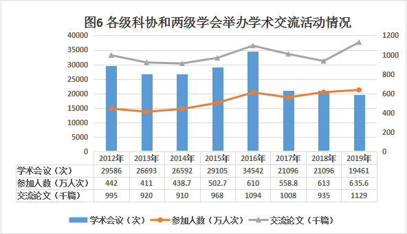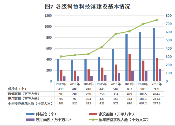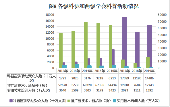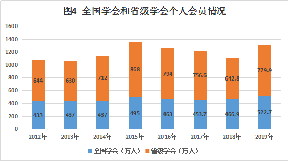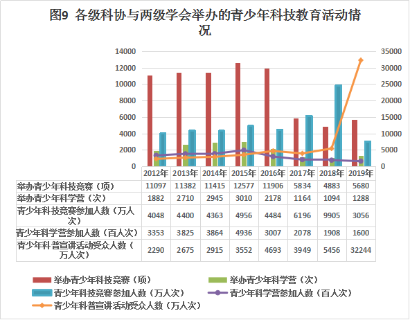 中國科協2019年度事業發展統計公報 2020年6月 2019年度,中國科協以習近平新時代中國特色社會主義思想為指導,全面貫徹黨的十九大和十九屆二中、三中、四中全會精神,緊扣慶祝新中國成立70周年主線,把強“三性”融入“四服務”,把“四個著力”工作要求貫穿始終,支撐高質量發展的組織力持續提升,為科技工作者服務持續深化,民間科技交流通道有效拓展,學術交流、科學普及、科技決策咨詢等各方面工作取得新進展新成效。 一、組織建設 (一)科協組織建設 各級科協3209個,直屬單位1907個。各級代表大會總人數305064人,其中委員會委員總人數81907人,常務委員會委員總人數32354人。 各級科協從業人員34491人,其中女性從業人員14968人。各級科協本年收入[2]總額134.0億元。 企業科協[3]17510個,個人會員264.9萬人。高校科協[4]1437個,個人會員75.5萬人。鄉鎮科協(街道科協)[5]26936個,個人會員143.9萬人。村科協(社區科協)[6]26637個,個人會員39.5萬人。農技協[7]2.7萬個,個人會員442.0萬人。 (二)學會組織建設 各級科協所屬學會29675個,其中中國科協所屬全國學會210個,省級科協所屬省級學會3848個。全國學會理事會理事[8]3.1萬人,省級學會理事會理事24.6萬人。 兩級學會從業人員50764人,其中全國學會從業人員3714人,省級學會從業人員47050人。 兩級學會本年收入總額91.8億元,其中全國學會本年收入總額49.6億元。 兩級學會個人會員[9]1302.6萬人,團體會員56.2萬個。其中全國學會個人會員522.7萬人,團體會員5.4萬個。省級學會個人會員779.9萬人,團體會員50.8萬個。 二、為科技工作者服務 (一)思想政治教育及能力提升 開展科學道德與學風建設宣講活動[10]18094場次,宣講活動受眾人數566.8萬人次。 舉辦干部教育培訓班4949次(期),共培訓54.6萬人次。 舉辦繼續教育培訓班21004場次,培訓參訓人數354.6萬人次。 (二)表彰舉薦 各級科協和兩級學會向省部級(含)以上科技獎項、人才計劃(工程)舉薦人才8390人次,向省部級(含)以上科技獎項推薦項目數3906項。 設立科技獎項數[11]1135項,其中全國學會設立391項。表彰獎勵科技工作者9.1萬人次,其中女性科技工作者2.5萬人次,45歲以下科技工作者4.8萬人次。 (三)媒體宣傳 通過媒體宣傳科技工作者13.9萬人次,其中中央/省級媒體宣傳科技工作者2.9萬人次。宣傳媒介呈多樣化,通過電視宣傳1.5萬人次,通過紙質媒體宣傳4.0萬人次,通過網絡與新媒體宣傳9.1萬人次。 (四)志愿服務 在基層直接為公眾提供科技攻堅、成果轉化、人才培養、科技咨詢、科學普及等方面專職科普工作者(科普工作時間占其全部工作時間60%以上的工作人員)6.9萬人,兼職科普工作者83.3萬人,科技志愿者[12]172.1萬人。 三、國際及港澳臺地區民間科技交流 各級科協和兩級學會加入國際民間科技組織[13]893個。在國際民間科技組織中任職專家1984人,其中擔任主席、副主席、執委或相當職務的高級別任職專家835人,其他一般級別任職專家1149人。 參加國際科學計劃[14]185項。參加境外科技活動4.4萬人次,參加港澳臺地區科技活動1.8萬人次。接待境外專家學者4.4萬人次。 四、學術交流 (一)推進創新創業服務活動 開展推進創新創業活動23884項,其中舉辦競賽、論壇、展覽等類型的活動7344項,開展咨詢、教育、培訓等類型的活動13468項,開展投融資、成果轉化等類型的活動1956項。 (二)專家服務 各級科協指導組建專家工作站[15]7627個,全年組織進站專家13.2萬人次。組建專家服務團隊[16]4761個,參加服務團隊專家17.5萬人次。 (三)標準制定 兩級學會研制技術標準[17]452個。兩級學會研制團體標準[18]1049個。 (四)學術會議 各級科協和兩級學會共舉辦學術會議19461場次,參加人數635.6萬人次,交流論文112.9萬篇。 舉辦國內學術會議[19]17823場次,其中舉辦學術年會7208場次。國內學術會議參加人數496.2萬人次,交流論文97.6萬篇。 舉辦境內國際學術會議[20]1473場次。境內國際學術會議參加人數135.5萬人次,交流論文14.3萬篇。 舉辦港澳臺地區學術會議[21]165場次。港澳臺地區學術會議參加人數3.9萬人次,交流論文1.0萬篇。 (五)學術期刊 各級科協和兩級學會主辦科技期刊[22]1802種??萍计诳傆?010.3萬冊,發表論文、文章數290.3萬篇。 五、科學普及 (一)科普基礎設施建設 截至2019年底,各級科協擁有所有權或使用權的科技館[23]978個??偨ㄖ娣e434.2萬平方米,展廳面積231.1萬平方米。已實行免費開放的科技館870個??萍拣^全年接待參觀人數7479.4萬人次。流動科技館1773個??破栈顒诱荆ㄖ行?、室)5.6萬個,全年參加活動(培訓)人數4078.3萬人次??破债嬂冉ㄖ娣e(宣傳欄、宣傳櫥窗)176.7萬平方米,全年展示面積[24]433.7萬平方米。科普大篷車1057輛,全年下鄉次數3.5萬次。科普大篷車全年下鄉行駛里程737.8萬公里,受益人數1834.3萬人次。 (二)科普宣講活動 各級科協和兩級學會舉辦科普宣講活動[25]25.0萬場次,其中專家科普報告會4.1萬場次,專題展覽1.2萬場次,科技咨詢8.1萬場次??破招v活動受眾人數14.4億人次。舉辦實用技術培訓8.4萬次,接受培訓人數1392.2萬人次。推廣新技術新品種17243項。各類科普活動覆蓋村(社區)21.5萬個次。 (三)青少年科技教育 各級科協和兩級學會舉辦青少年科普宣講活動47394場次。青少年科普宣講活動受眾人數3.2億人次。舉辦青少年科技競賽5680項,參加競賽的青少年3056.5萬人次,獲獎人數141.1萬人次。舉辦青少年科學