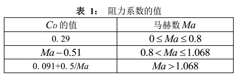 通過查閱相關參數數據得到衛星質量m=13200kg, 并假設衛星受阻面積為16m2, 對地軌道速度為7800 m/s, 即Ma= 22.9. 從表 1中我們可以得到相應的CD=0.11283. 從ρ(h)函數關系可以解出如下表所示的在一些特定高度的大氣密度估計值.