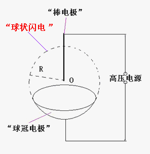 “棒電極”在球心對“球冠電極”“超短時間內的高能”(超高壓)充電、放電,可以產生“球狀閃電”,其機理為:“雙向激擊”、“球冠振蕩”。若地面為“球冠電極”,則表現為“滾地雷”“火球”,若空中云為“球冠電極”,則表現為空中“光球”。因為“球冠振蕩”的頻率的不同,“球狀閃電”內部呈現“嵌套球狀”,由外向里頻率由小到大,在可見光波段由外向里顯現為紅、橙、黃、綠、藍、靛、紫,而由外向里看,因疊加合成呈現白色,但是,當最外面的頻率較小時,也可能是黃色或綠色或藍色的;一個大“光球”,可以分離為兩個或幾個小“光球”,但其顏色將會“變深”(如圖6、7)。 [6]