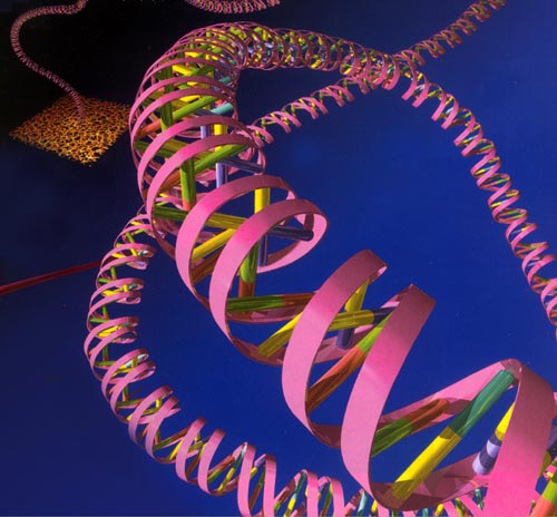 1953年4月25日,世界權(quán)威雜志《自然》雜志發(fā)表了沃森、克里克的一篇900多字優(yōu)美精煉的短文,宣告了DNA分子雙螺旋結(jié)構(gòu)模型的誕生。這個(gè)結(jié)構(gòu)模型的要義是:DNA是一個(gè)長長的雙鏈分子,由兩條同軸反向相互纏繞的多核苷酸鏈組成,外側(cè)是由脫氧核糖和磷酸根組成的分子骨架,中間是由互補(bǔ)的堿基對組成的階梯,堿基配對方式是A配T,C配G;堿基對間距為0.34納米,每10個(gè)堿基對形成一個(gè)螺旋周期,螺旋直徑為1納米。這個(gè)模型既能從螺旋性、分子直徑、堿基對的幾何學(xué)尺度等方面闡明X射線衍射圖像,又能以堿基專一性互補(bǔ)配對來解釋查伽夫當(dāng)量定律。DNA雙螺旋結(jié)構(gòu)是一個(gè)極為成功、無懈可擊的DNA分子結(jié)構(gòu)模型,它由兩條右旋但反向的鏈在同一個(gè)軸上盤而成,像一個(gè)螺旋形的梯子,生命的遺傳密碼就列在梯子橫檔上。據(jù)科學(xué)家統(tǒng)計(jì),一個(gè)體細(xì)胞的全部DNA“螺旋樓梯”長約2米。若將一個(gè)人的全部DNA連接起來,可以在地球和太陽之間扯上80個(gè)來回。 DNA分子雙螺旋結(jié)構(gòu)模型的發(fā)現(xiàn),是生物學(xué)史上的一座里程碑; 1962年,沃森、克里克因發(fā)現(xiàn)DNA分子結(jié)構(gòu),與改進(jìn)了X射線衍射技術(shù)的威爾金斯一起獲得了諾貝爾醫(yī)學(xué)或生理學(xué)獎(jiǎng)。