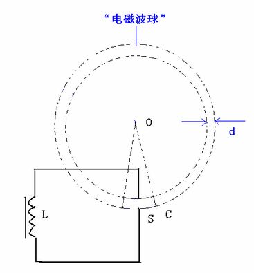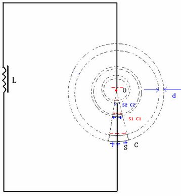 如圖7,在一個由“點電極”O與“球冠電極”S組成的“球錐空間”中,如果O與S之間產生了足夠的“特高電壓”,那么這個“球錐空間”就可以被“雙向激擊”,依次連續發生“球冠振蕩”……、S2、……、S1、……、S,產生不同頻率的“電磁波球”,并且呈“嵌套球狀”分布,由外到里即由球冠S到點O,產生的“電磁波”的頻率越來越大。