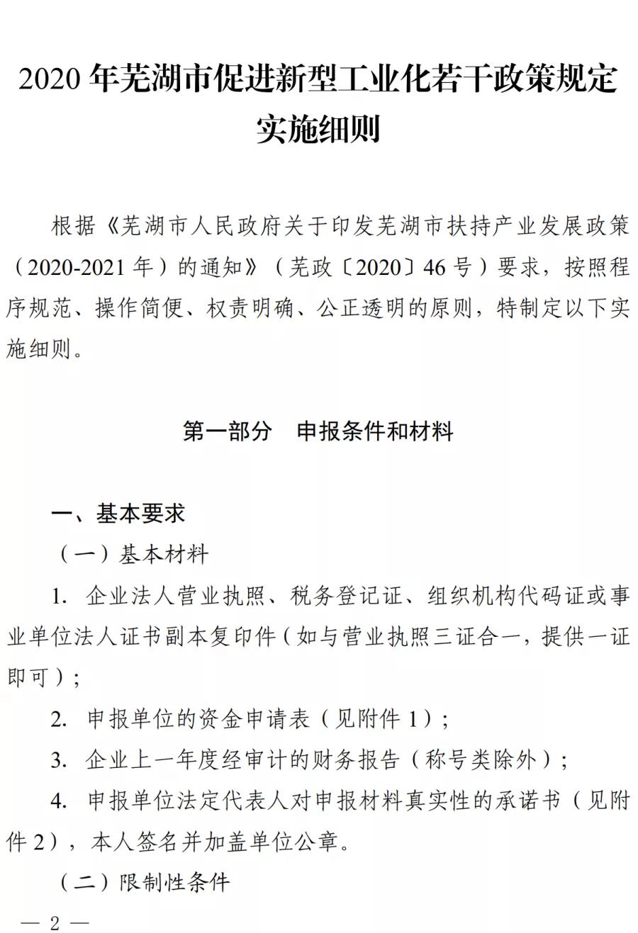 蕪湖市2020年促進(jìn)新型工業(yè)化若干政策規(guī)定實(shí)施細(xì)則印發(fā) 作者: 安徽新天源建設(shè)咨詢有限公司 最后修訂: 2021-02-05 08:59:23 摘要: 附件