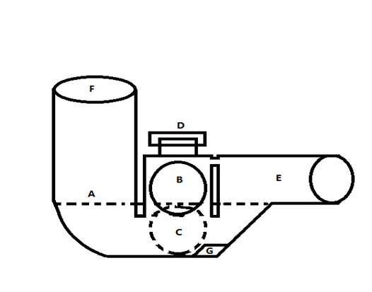 排水管的設計(如圖):本設計是在U型管道的基礎上增加固體阻斷機構(球形、圓柱形等多種形體),當U型管道中填充一定量的水時,機構內的阻斷球就會在浮力的作用下,處于完全開放的狀態,當U型管道內的水因得不到及時補充而氣化,這時,B球體在重力作用下,隨著管內水位下降而下落。在管道底部、球體下落方向增設斜面,增加球體下落壓力,增加球體密封效果。當管道內補充一定的水量時,球體的水的浮力作用下,上浮到B區,保持管道通暢。從而達到有效阻止有害物質回流的目的。