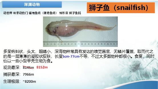 目前,對海斗深淵的生物系統還沒搞清楚。在海斗深淵,壓力是1噸/平方厘米、溫度低、光線暗、幾乎就是黑暗、地震也多。這里的生物的生命真是奇特,能在這樣的環境中生存和繁殖。我們的儀器下潛到水深萬米一下,也要經受1噸/平方厘米的壓力,在設計上會遇到很多問題。