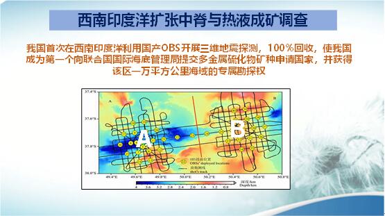 在全球的海洋中,大部分海洋為公海,有些國家已圈出自己具有礦產調查和開采權的某片海域。我們國家在西南印度洋布設了“中國結”的地震臺網,開展三維地震觀測。并第一個向聯合國國際海洋海底管理局申請,獲得了這一地區一萬平方公里的多金屬硫化礦物的專屬開采權。