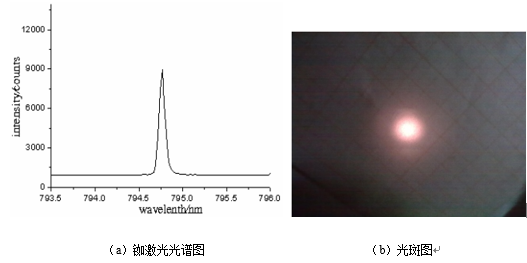 電子所是在國內率先開展DPAL研究工作的單位之一,2012年5月,電子所實現了半導體泵浦線偏振基模銣激光輸出,經繼續對實驗進行改進,獲得了最高2.8W的銣激光輸出,光光轉換效率達21%。實驗光路如圖2-7所示,實驗測量的銣激光光譜以及光斑如圖2-8所示。