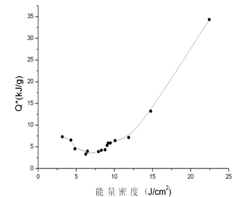 如圖3-5所示,單位面積除漆質量先是隨著能量密度上升,在能量密度為6~8 J/cm2之間達到峰值,隨后下降。當激光能量密度大于12 J/cm2后,單位面積除漆質量顯著下降,此時,激光與樣品表面的作用機理可能已發生突變。而進一步分析Q*值(Q*=激光能量密度/單位面積除漆質量)隨能量密度的變化曲線,如圖3-6所示。可以看出,當能量密度大于10 J/cm2后,Q*值隨著激光能量密度的提高大幅提高,說明激光能量的利用效率顯著下降。且在入射激光能量密度為6.5 J/cm2時,Q*值為極小值,約為3 kJ/g。