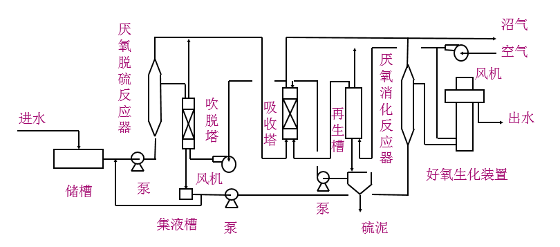 在高硫酸鹽廢水處理集成系統中,首先硫化氫先經過吹脫處理,降低硫化氫對后續反應中對厭氧反應的抑制。經吹脫過的廢水進入厭氧硫酸鹽還原反應器,進行一系列后續高效的硝化與反硝化處理,最終出水達標排放(圖1-9)。