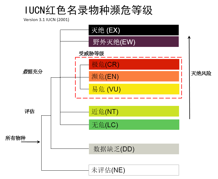 IUCN自20世紀60年代成立之日起,就設立了物種生存委員會(SSC),開始編制和印刷《IUCN瀕危物種紅皮書》,后來隨著評估物種的增加,印刷版逐步發展為網絡版的《IUCN瀕危物種紅色名錄》,定期編制發布。IUCN/SSC研究制定了《IUCN物種紅色名錄瀕危等級和標準》,根據物種的種群數量和分布情況等,評估其生存狀況,確定其瀕危等級。IUCN瀕危物種等級標準分為“有評估數據”和“數據缺乏”兩類,“有數據評估”中又分為“滅絕”、“野外滅絕”、“區域滅絕”、“極?!?、“瀕?!薄ⅰ耙孜!?、“近危”和“無危”等8個級別,從“無?!钡健皹O?!?,滅絕風險逐步上升,瀕危等級逐步增加。瀕危等級標準有5個指標,分別是種群下降、有限地理分布區、下降小種群、非常小或非常有限的種群、以及模型模擬等量化分析,根據這些指標的數量閾值,來評估物種的瀕危等級。