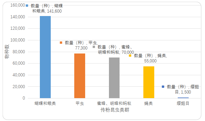 傳粉昆蟲占所有動物傳粉的80%~85%,為植物-傳粉者生態系統提供重要服務,其重要性得到科研工作者和大眾的廣泛認同。據估計,全球生物物種多樣性約870萬,昆蟲占一半以上,是自然界最主要的傳粉者。目前,已報道的傳粉昆蟲約35萬種,涉及鱗翅目(約14萬種)、鞘翅目(約7.7萬種)、膜翅目(約7萬種)、雙翅目(約5.5萬種)以及其他類群(約0.8萬種)。蜜蜂是最主要的傳粉昆蟲,約有17,000種,全球107種重要作物種類中的90%是由蜜蜂完成傳粉。