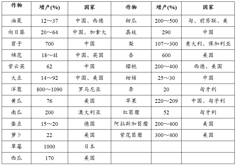 表1 國內外用蜜蜂為農作物和果樹授粉的增產效果