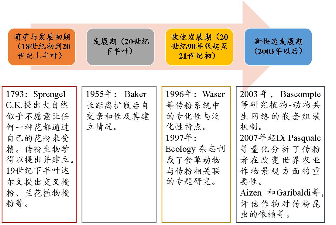 由于傳粉昆蟲的重要性以及目前所面臨的危機已經引起科學家和民眾的廣泛關注。諸多地區級、國家級乃至全球級別的傳粉研究已經取得了階段性的成果。就全球范圍來說,傳粉昆蟲的研究主要包括四個時期,分別為:1)萌芽與發展初期(18世紀初到20世紀上半葉);2)發展期(20世紀下半葉);3)快速發展期(20世紀90年代起至21世紀初);4)新快速發展期(2003年以后)。