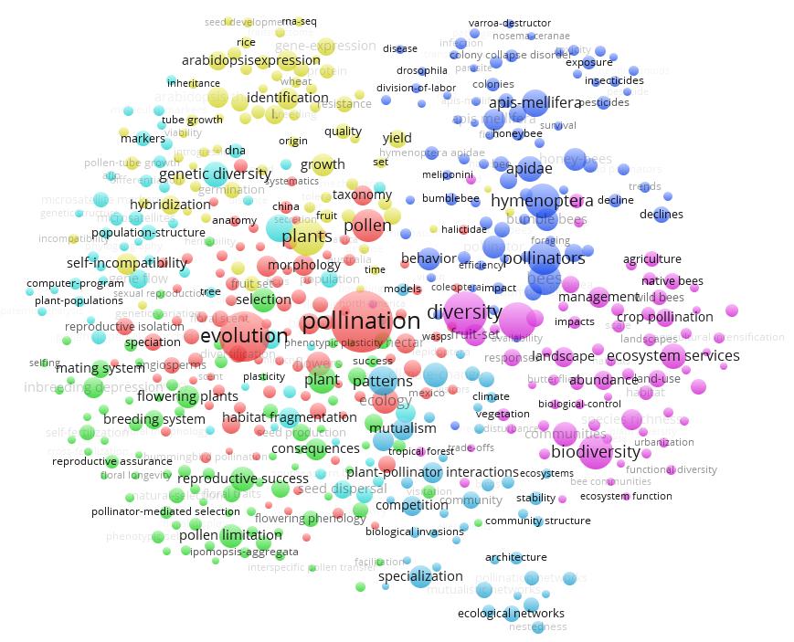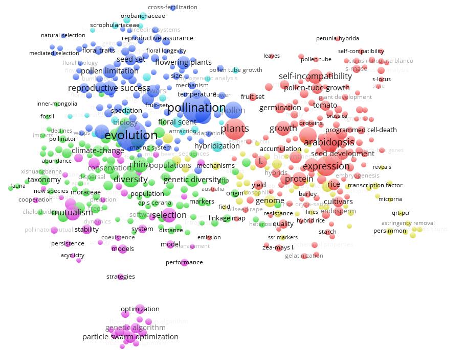 與此同時我們還通過ESI對pollination和pollinator等關鍵詞進行檢索,可以大致得出傳粉昆蟲研究領域的現有研究前沿如下:1)常用新煙堿類殺蟲劑對蜜蜂的殺傷作用;2)野生授粉昆蟲對農業增收和作物健康的積極影響;3)傳粉昆蟲種群測量與評估;4)花朵與傳粉昆蟲的生態聯系。通過利用Vos Viewer軟件繪制傳粉生物學關鍵詞共現(co-occurrence)聚類圖,獲得傳粉生物學領域的研究熱點包括:1)傳粉昆蟲的形態學、系統進化、分類學方面的研究;2)傳粉昆蟲介導的植物繁殖、選育、選種等的研究,以及花粉限制對傳粉昆蟲的影響;3)殺蟲劑導致傳粉昆蟲,尤其是蜜蜂、熊蜂的種群下降的影響;4)傳粉昆蟲介導的植物基因表達、生長、增產等;5)景觀變化、城市化等環境因素導致生物多樣性降低、傳粉服務功能下降、傳粉昆蟲群體數量下降等影響評估,并提出相關的控制與管理措施;6)植物-傳粉昆蟲互作與共生、植物與傳粉昆蟲形成的生態網絡結構等方面的研究;7)傳粉使植物基因流擴散,使植物基因變異和多樣性。