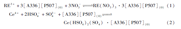 離子液體萃取稀土離子的過程機理還是比較復雜的,這種復雜來自于很多方面。其萃取稀土(III)和缽( IV)的機理還是以中性絡合機理為主,如萃取平衡方程(1)和(2)所示,同時可能還伴隨一些副反應。該過程萃取稀土鹽,酸堿消耗比較小,是提高稀土萃取效率的重要方式之一。