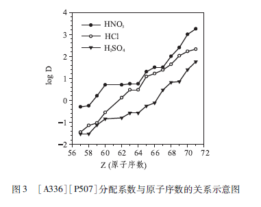 [A336 ] [ P507]對稀土離子的萃取趨勢是隨著原子系數增加分配系數增大,如圖3所示。不同酸性條件下的相對分配系數關系順序:HN0> HCl >H2SO4,與酸根離子的水化能ΔG順序一致,硝酸根的水化能最低(ΔGO=-314kJ/mol),硫酸根水化能最高(ΔGO =-1103 kJ/mol )。