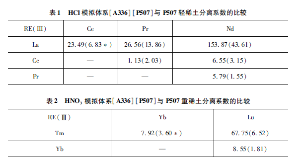 P507(III)萃取稀土按照正序萃取,遵循“四分組效應”,稀土的分配系數隨著原子序數的增加而增大,而堿性萃取劑[A336]C1在HN03體系中通過陰離子交換萃取稀土是倒序萃取,稀土的分配系數隨著原子序數的增加而減小。兩種效應共同作用,導致[A336 ] [ P507 ]分離稀土選擇性增強,相鄰元素間的分離系數明顯提高。同時,陽離子[A336]+和陰離子[P507 ]-的離子半徑大,空間位阻增加,也有助于提高稀土(III)的萃取選擇性。模擬實際體系的組分混合物,在HCl體系中在輕稀土間的分離系數也有較大的提高,尤其是Pr/Nd分離系數5. 79明顯高于P507體系的1. 55(徐光憲主編,《稀土》,第二版,1995 ) ,見表1。在HN03體系中重稀土Tm/Yb/Lu的分離系數較大,明顯高于目前的P507體系(李德謙等,中國發明專利,ZL200510016682. 6 ),見表2。[A336 ] [P507 ]的特殊結構對部分稀土離子分離的選擇性方面比較突出,與其較大的空間位阻有關。
