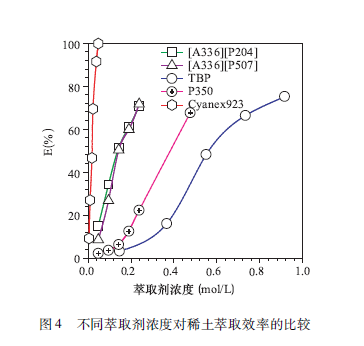 相同條件下在硝酸體系中萃取能力順序比較:TBP(磷酸三丁醋)< P350(甲基磷酸二甲庚醋)< [A336] [P507] < Cyanex923(圖4)。盡管Cyanex923是萃取稀土的優良萃取劑,但成本比較高,且難以國產化,實際應用中還是受到一定的影響。[A336 ] [ P507」的優勢還體現在酸堿消耗低,反萃取完全。