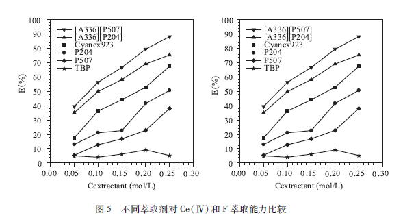 離子液體萃取劑應用于H2SO4、體系中萃取鈰( IV)和氟,鈰( IV)與氟以CeF3+絡合,形成CeF ( HSO) ( SO4 )2· [ A336 ] [P507 ]萃合物。分離鈰( IV),牡和稀土的順序:鈰( IV)>牡(W)>稀土(III ) o萃取劑的萃取能力比較順序:[A336 ] [ P507>Cyanex923 > TBP。對氟的萃取能力有相似的趨勢,其結果見圖5。我國輕稀土礦含有近50%的缽,將缽(W)與稀土(111)分離,可以大大減少稀土萃取分離的壓槽量,縮短分離流程,降低成本。