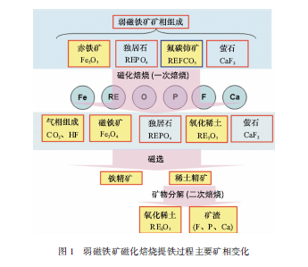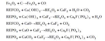 弱磁鐵礦一步法磁化與稀土礦物分解過程的反應如下: