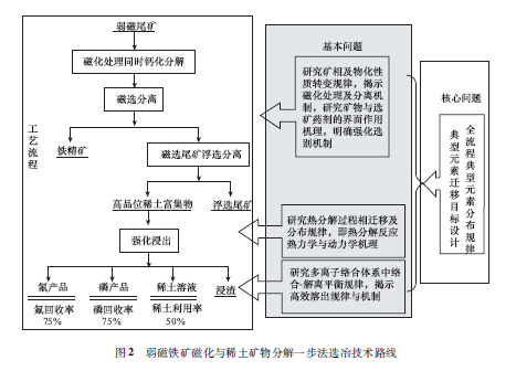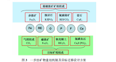 為實現上述目標,弱磁鐵礦磁化與稀土礦物分解一步法礦物重組機制及目標遷移設計方案如圖3所示。