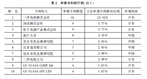 從不同年份上來看,中國專利不斷增加,原來口本比中國多,后來中國慢慢增多。但實用的還是不多,仍然還是一個問題,還得有進一步的提高。另外,從申請單位來看,排在前十名的都是中國和口本的一些單位(表2)。比如說三洋電機株式會社、湯淺株式會社、松下電器產業株式會社、浙江大學、北京有色金屬研究院、比亞迪等。