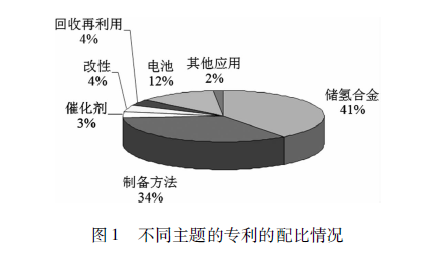 這里面是不同的研究主題分布,還是以儲氫合金的開發居多一點,然后還有催化劑、改性等(圖1)。我覺得在這里面可能有三個領域在技術上發展比較突出一點。第一個就是成分的改變,通過改變儲氫合金成分開發新的合金提高了鎳氫電池容量,是一個很重要的進步。傳統是ABS型的,后來跟ABS型的和AB2型的結合到一起,就變成了A2B7型的,這就是口本三洋公司開發出來的。這個儲氫合金成為了目前研究的主流,容量比傳統的要大很多,成分上的突破是一個很大的進步。第二個是甩帶快淬技術在儲氫合金粉體制備上的應用,原來這種技術最早是用來制備非晶態合金的,后來用到了永磁粉體的制備,現在又開始進人到了鎳氫電池上面來了,對于鎳氫電池容量和穩定性的提高都有非常大的幫助。第三個重要的突破的是儲氫合金表面改性,表面有一層鎳,可以進一步提高電導率,增加電流。這三方面是在技術上有了比較大的提高和發展。