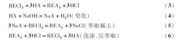 萃取分離過程主要利用有機萃取劑萃取料液中易萃組分,獲得高純度的難萃組分,通過洗滌有機相的難萃組分獲得純的易萃組分,達到分離目的。目前稀土分離均使用酸性萃取劑(HA),萃取過程可用反應(3)表示,為了提高和穩定萃取劑的萃取分離能力,一般均對酸性萃取劑進行皂化后再與待分離的稀土料液進行萃取交換,過程為反應(4),(5),負載稀土的有機相用鹽酸進行洗滌