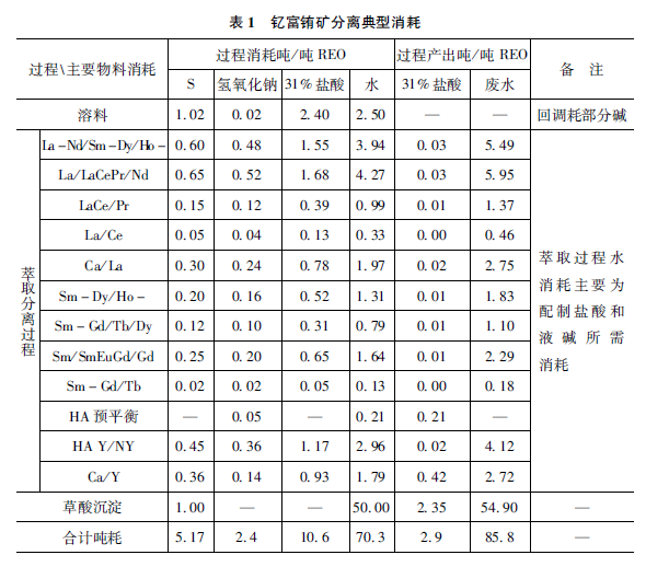 從目前的稀土分離基本工業流程,不難注意到,各段工藝間相對獨立,過程中消耗酸堿等化工原料和水,最終處理后作為廢水排放。以中憶富鋪稀土原料分離為例,典型試劑消耗如表1,每分離提純1噸稀土氧化物,消耗10噸左右的鹽酸、2. 4噸燒堿等化工材料,產生85噸廢水,其中含鹽量6. 8噸。