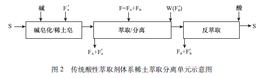 傳統酸性萃取劑體系稀土萃取分離流程,每一個分離單元的工藝如圖2所示,萃取劑有機相S需要用堿皂化,萃取難萃稀土A制取負載難萃稀土有機相,進人分離段交換萃取分離對象(A和B)中的易萃稀土B以獲得純稀土A水相,隨后用純易萃稀土B洗滌萃取劑有機相中的難萃稀土A以獲得負載純易萃稀土B的有機相,最后用酸反萃取使B轉型至水相,萃取劑有機相得到再生循環使用。