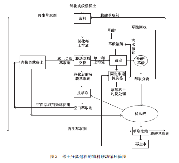 但是,聯動萃取分離工藝還不足滿足稀土分離的綠色要求,為此提出進一步發展聯動萃取分離工藝和實現稀土分離物料聯動循環的新設想。
