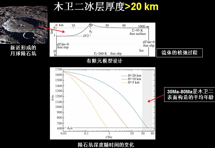 冰層厚度很重要:厚的冰層可能發生對流,有利于表面與水的連通;過薄的冰層不利于對流的發生,限制了表面與水的連通。動力學數值模擬揭示:木衛二冰層厚度大于20km。
