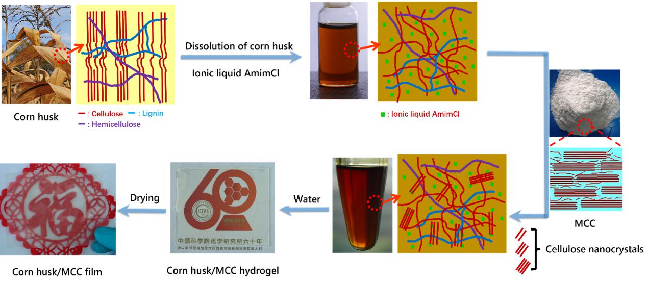 我們做出的兩類離子液體溶劑,可以在一個很溫和的條件下(一般不超過100℃)將纖維素溶解。過去一二十年有很多人做纖維素的離子液體體系,目前公認最好的三種離子液體中有兩種是我們發(fā)明的,其中AmimCl可以溶解木材,被稱為溶解能力最強的溶劑。后來我們提出了它的溶解機理,我們認為離子液體陰陽離子結(jié)構(gòu)和纖維素羥基的分別作用把里面原來氫鍵打開,像剪漁網(wǎng)似的,使它變成線性的分子才能溶解。